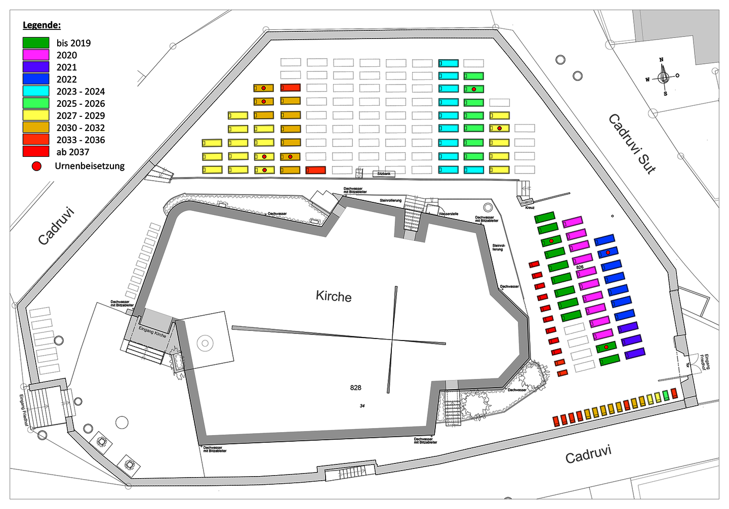 Aus den Gräberlisten der Gemeinde übernehmen wir die unterschiedlichen Ruhefristen / Grabrechte und Bestattungsarten und stellen dies farbig dar.