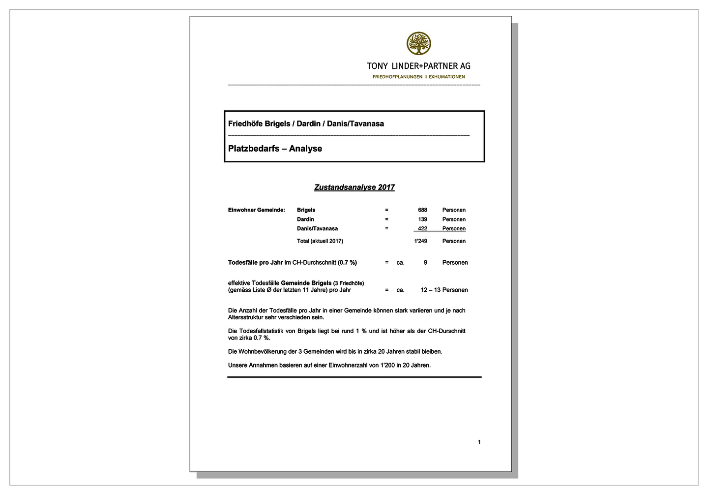 Für eine zukunftsorientierte Planung benötigt man zuerst die bestehenden Daten der Gemeinde (Bevölkerung, Bestattungszahlen, Gräberanzahl und Grabarten). Für den Kunden analysieren wir die Zahlen und berechnen diese für den Platzbedarf der Zukunft.